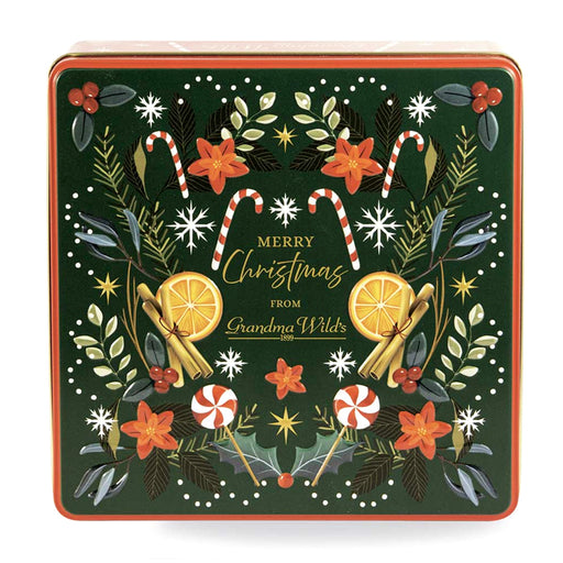 Visualizza tutti i dettagliUna latta natalizia elegante e scenografica: sfondo verde bosco, dettagli in rilievo e decorazioni in stile vintage con bastoncini di zucchero, ara...