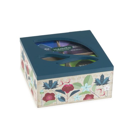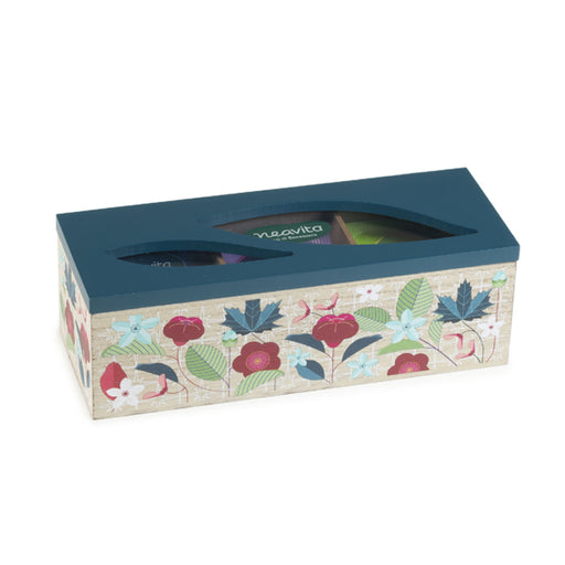 Visualizza tutti i dettagliUna scatola elegante in legno, con decoro floreale e coperchio azzurro intagliato, lascia intravedere le bustine colorate degli infusi Neavita. Il ...