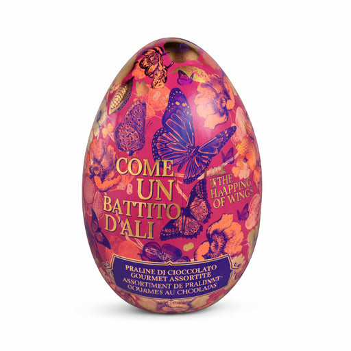 Un uovo che sembra un giardino in fiore. Farfalle dorate, sfumature calde, dettagli che raccontano primavera. Questa latta a forma di uovo della co...