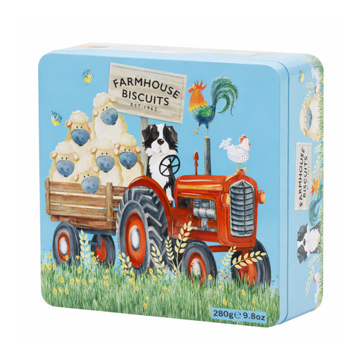 Un trattore rosso in mezzo al prato, pecore curiose, un gallo fiero e un simpatico cane da fattoria: la latta Farmyard Tractor di Farmhouse Biscuit...