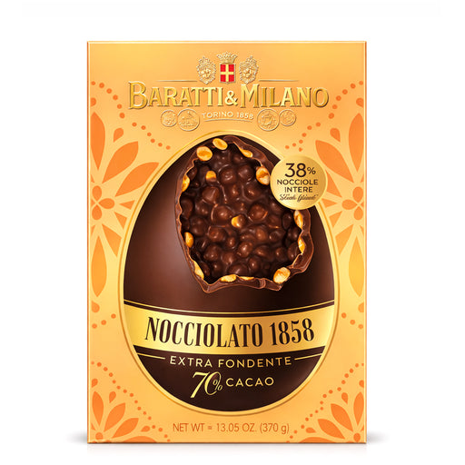 Visualizza tutti i dettagliPensato per gli amanti del cioccolato dal carattere deciso, l’Uovo di Pasqua Nocciolato 1858 Fondente di Baratti & Milano è una creazione irres...