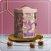 Una latta ottagonale che ricorda una lanterna primaverile, con coperchio rosa cipria e anello dorato. Farfalle, fiori e dettagli botanici si intrecciano su un fondo caldo e luminoso. È una di quelle scatole che non si buttano. Si tengono. Si riusano. Si espongono.