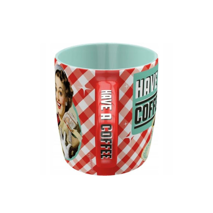 Una mug dal design vintage - ispirato alle vecchie pubblicità americane - con colori vivaci, caratteri retrò e un irresistibile tocco nostalgico.