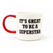 Sul retro della tazza, la scritta in nero bold “IT’S GREAT TO BE A SUPERSTAR” ti ricorda che sì, ogni sorso può essere da vera star! La grafica è fedele allo stile originale dei fumetti Peanuts, con linee nette e colori vivaci che fanno subito buon umore.