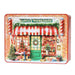 Un’incantevole facciata in stile vittoriano, decorata a festa, ci accoglie nella bottega di Babbo Natale: la latta “Santa’s Workshop” è una piccola meraviglia illustrata, tutta da scoprire. Sotto un tendone a righe rosse e bianche, due schiaccianoci in uniforme sorvegliano l’ingresso, mentre pacchetti regalo, rotoli di carta da incarto, alberelli addobbati e dolcetti colorati riempiono ogni angolo della scena. I dettagli in rilievo esaltano la profondità della composizione e rendono questa scatola un piccolo teatro natalizio: sembra quasi di sentire il tintinnio degli strumenti nella bottega degli elfi. Una latta collezionabile, perfetta da regalare o tenere esposta durante le feste.